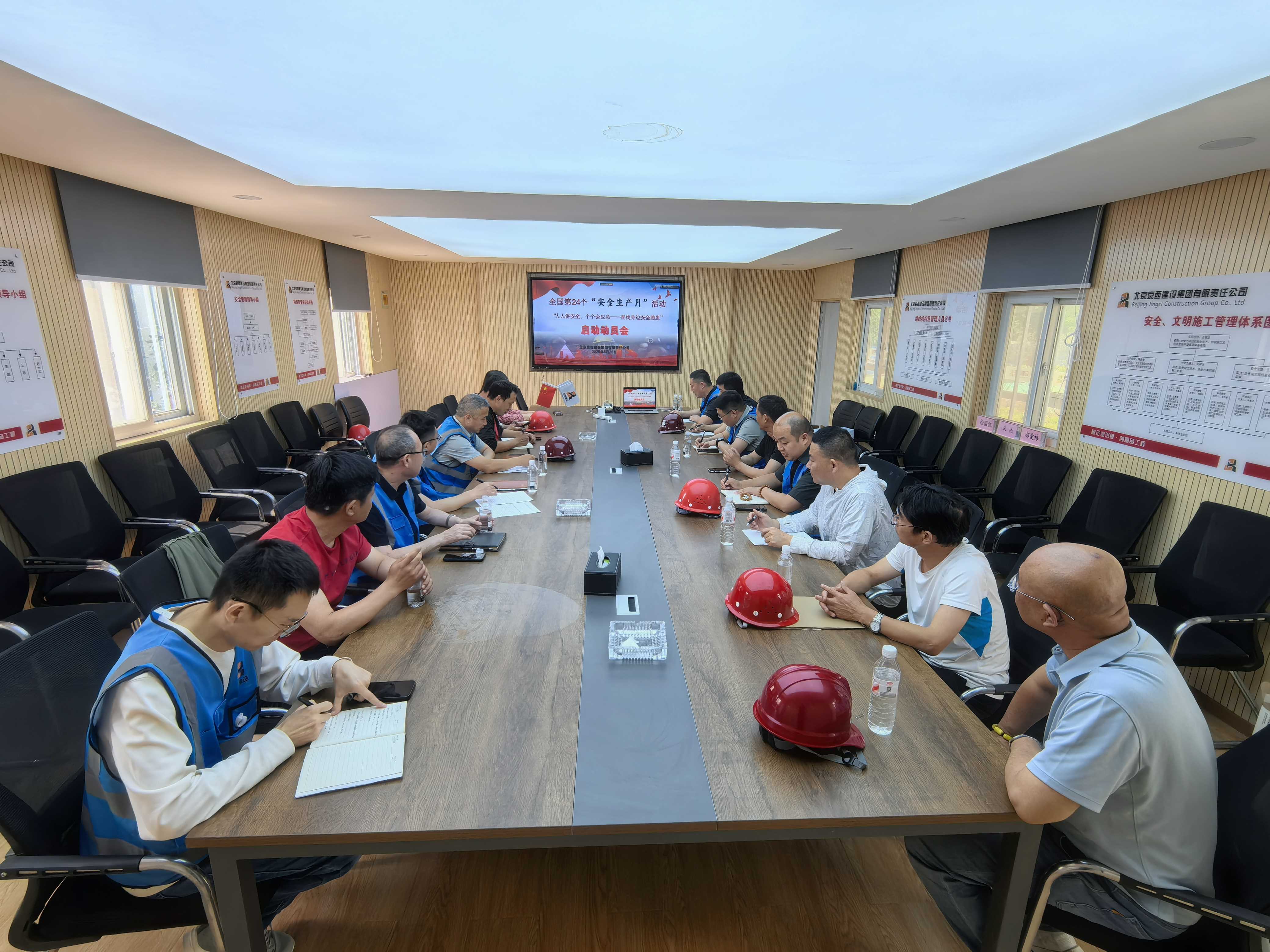 5 月 26 日,京西建设 “安全生产月” 启动会采用线上线下相结合的方式在政务中心项目现场顺利举行。公司总工程师鲁昌伍、安全总监李赵荣、工程管理部及各在施工程主要负责人共同参加了以 “人人讲安全、个个会应急 —— 查找身边安全隐患” 为主题的安全生产月活动。