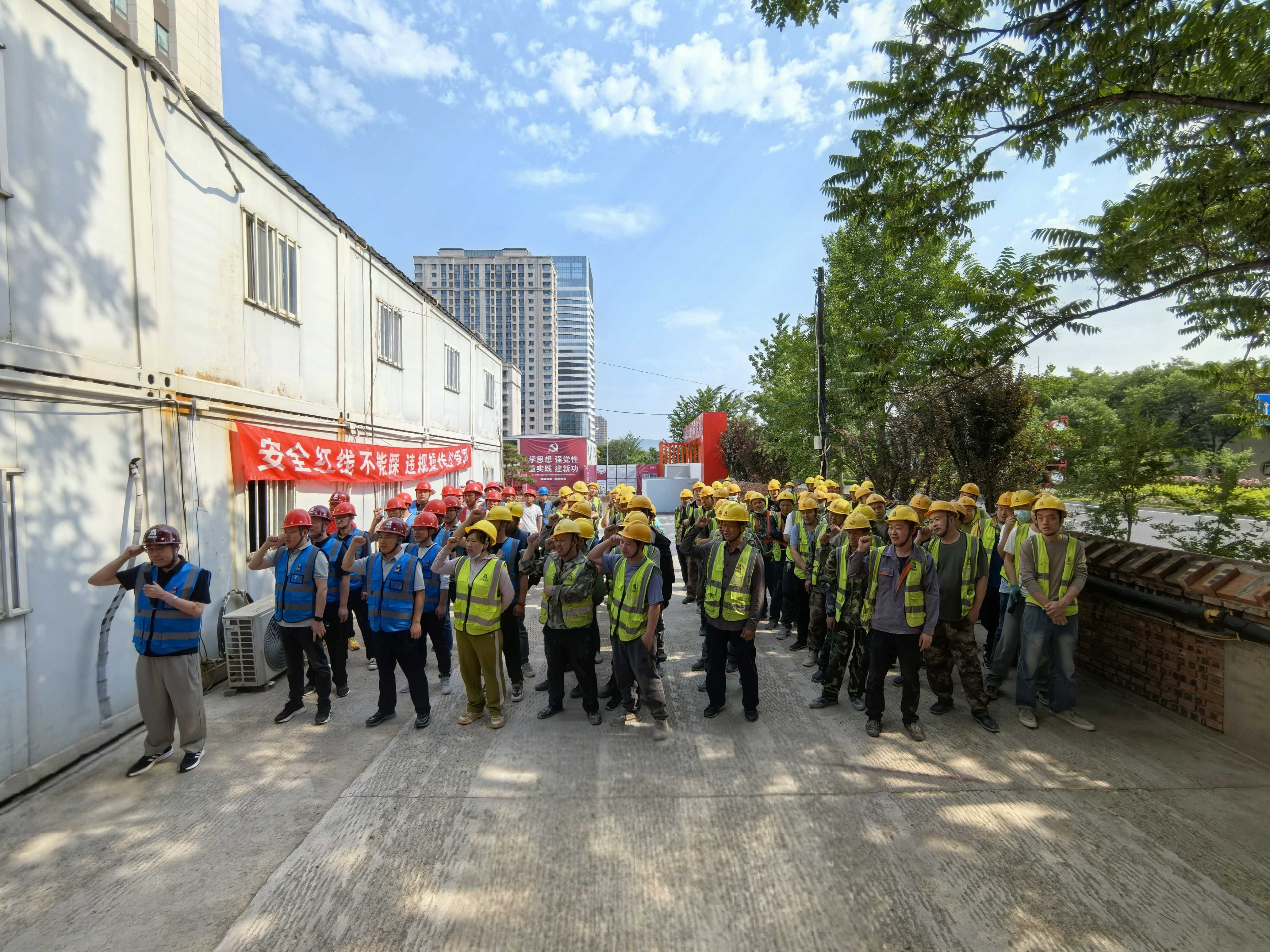随后,在工程部主管李志军的带领下,现场全体人员庄严举起右手,进行安全宣誓。铿锵有力的誓言在项目上空回荡,每一字每一句都彰显着京西建设人对安全生产的坚定决心与责任担当,将“安全第一” 的理念深深烙印在每个人的心中。